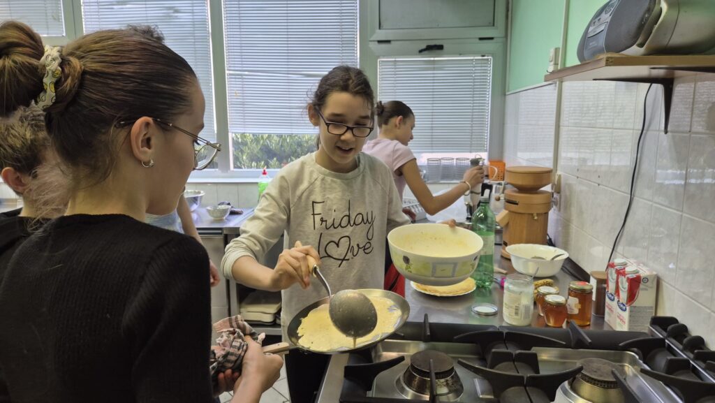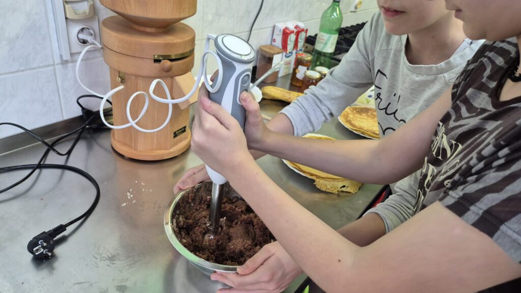 Slijedilo je pečenje palačinki, i to u nekoliko varijacija: s mlijekom, bez mlijeka te uz dodatak različitih nutritivno bogatih sastojaka. Pekle su se na kokosovom ulju, a mirisi su ubrzo ispunili cijelu učionicu.
