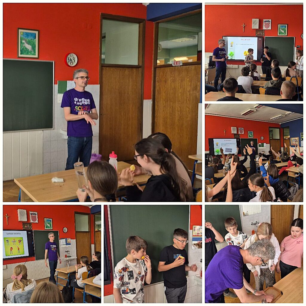Za učenike 5. i 6. razreda održano je interaktivno predavanje „Čudesan svijet kemijskih osjetila“, kroz koje su učenici istraživali ulogu osjeta okusa i njuha u svakodnevnom životu. Na pristupačan i zanimljiv način upoznali su se s biokemijskim osnovama tih osjetila te kritički promišljali o pouzdanosti vlastitih osjetilnih doživljaja.