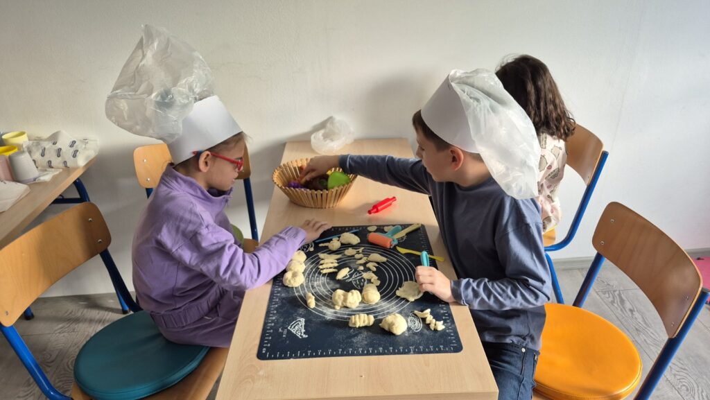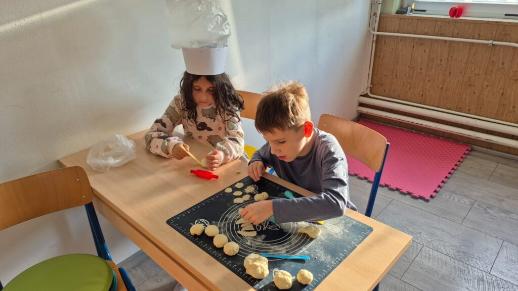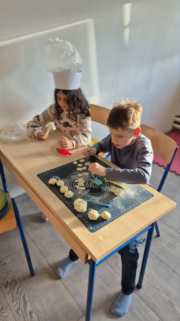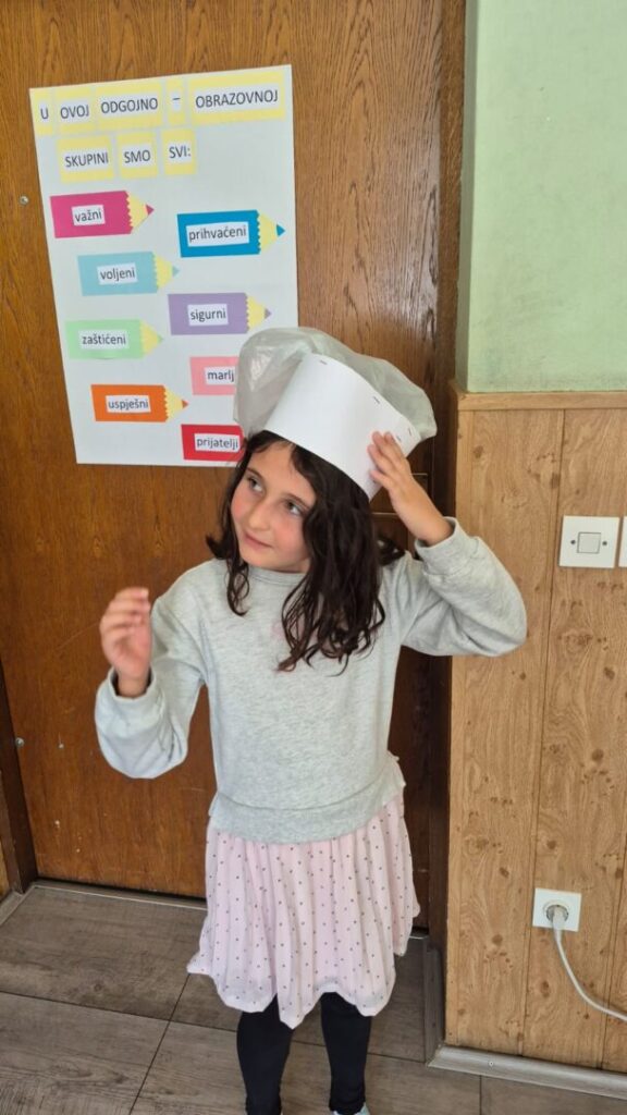 U veseloj i toploj atmosferi izrađivali su pekarske kape, izvodili pjesmicu „Pekar” uz pokrete te zajedno pročitali zahvalu za plodove zemlje. Potom su sami mijesili tijesto i oblikovali pekarske proizvode, razvijajući pritom strpljenje, finu motoriku i osjećaj zajedništva.