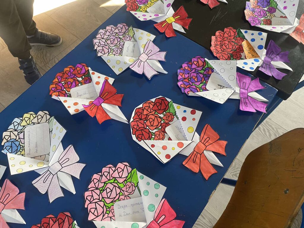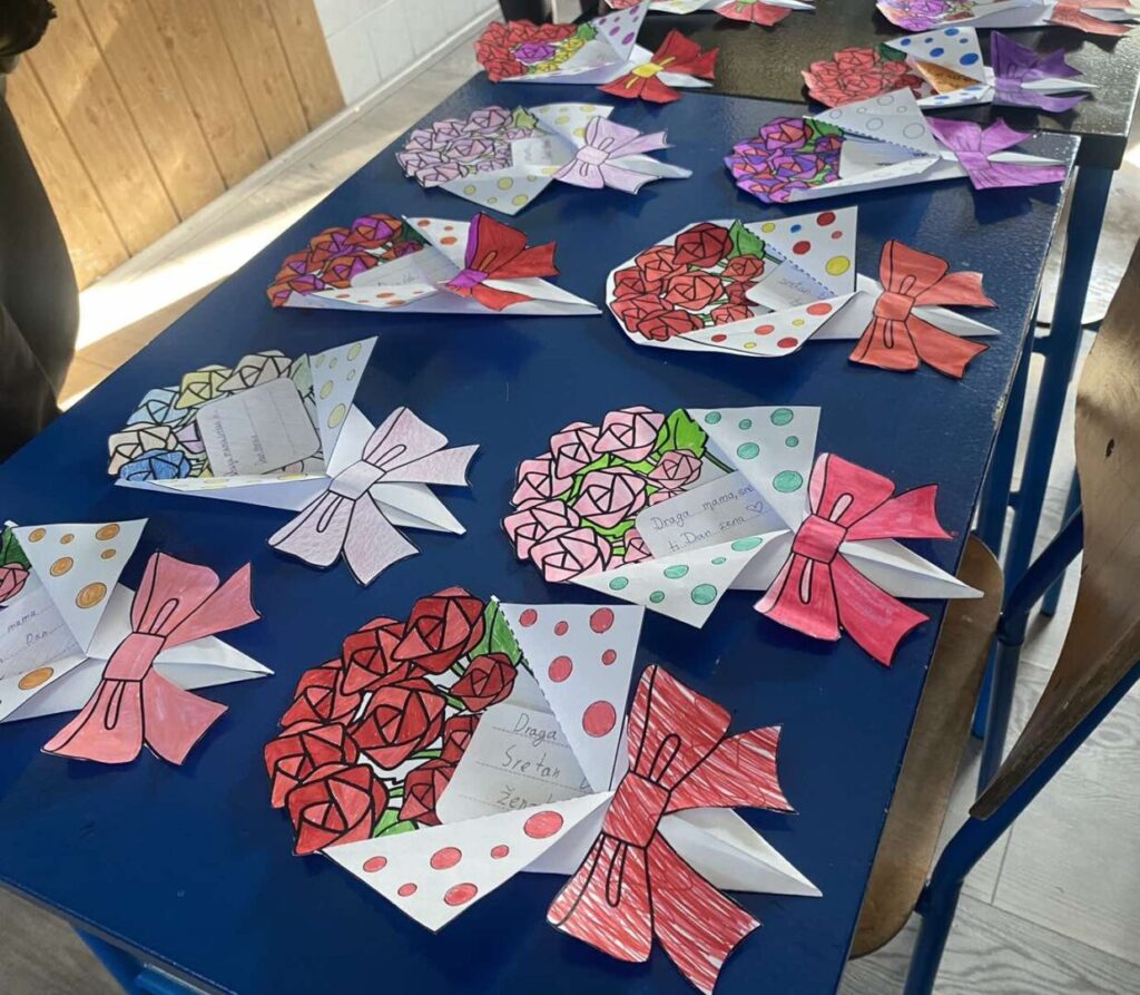 Učenici su izrađivali buketiće cvijeća od papira, koje su pažljivo oblikovali, rezali i ukrašavali. Svaki je buketić nosio i simboličnu poruku upućenu njima dragim ženama – majkama, bakama, tetama, sestrama ili učiteljicama. Kroz ovu kreativnu aktivnost učenici su imali priliku pokazati svoju maštovitost, ali i razmisliti o tome koliko su žene važne u njihovom svakodnevnom životu.