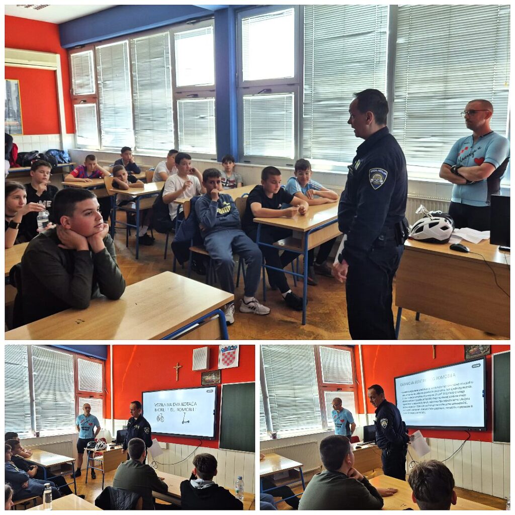 Zoran Filipović je kroz praktičan prikaz na profesionalnom biciklu demonstrirao osnovne mjere sigurnosti u vožnji, podijelio vlastita iskustva iz prometa te zajedno s policijskim službenicima pregledao bicikle kojima učenici dolaze u školu, naglašavajući važnost njihove tehničke ispravnosti.